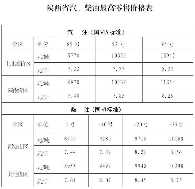 根据现行成品油价格形成机制,明起我省汽、柴油价格相应上调,92号汽油和0号柴油最高零售价格每升均上调0.22元。调整后各价区汽、柴油最高零售价格为:92号汽油西安市场每吨10356元(7.77元/升),中北部价区执行西安市场价格,陕南价区每吨10462元(7.85元/升);0号柴油西安市区每吨8755元(7.44元/升),省内其他市场每吨8955元(7.61元/升)。成品油零售企业可在不超过汽、柴油最高零售价格的情况下,自主制定具体零售价格。