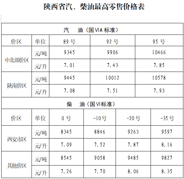 根据现行成品油价格形成机制,明起我省汽、柴油价格相应下调,92号汽油和0号柴油最高零售价格每升分别下调0.33元和0.34元。调整后各价区汽、柴油最高零售价格为:92号汽油西安市场每吨9906元(7.43元/升),中北部价区执行西安市场价格,陕南价区每吨10012元(7.51元/升);0号柴油西安市区每吨8345元(7.09元/升),省内其他市场每吨8545元(7.26元/升)。成品油零售企业可在不超过汽、柴油最高零售价格的情况下,自主制定具体零售价格。
